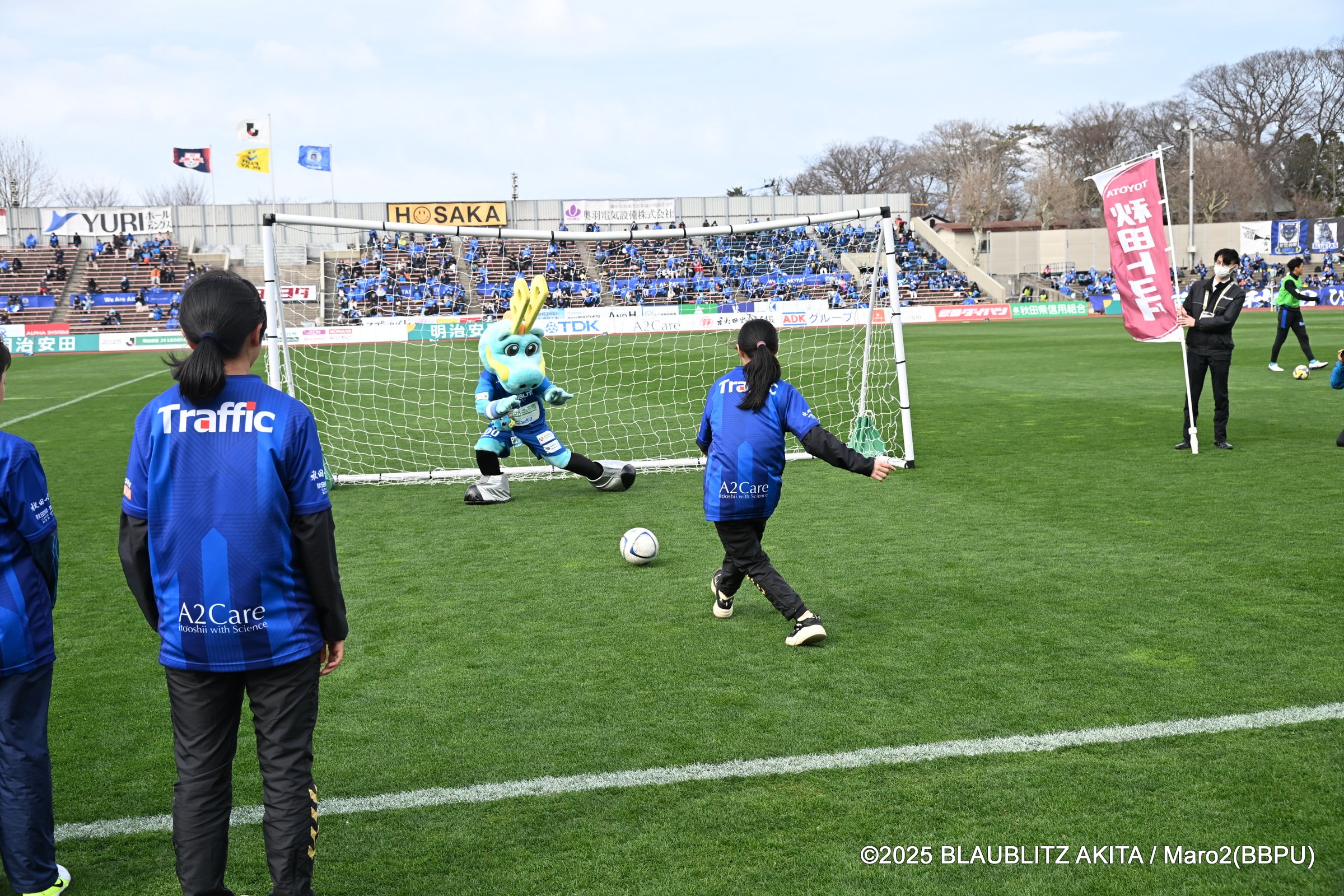 試合会場では、子どもたちによる選手のエスコートや、ハーフタイム中に、ブラウゴンとのPK対決が実施されました。